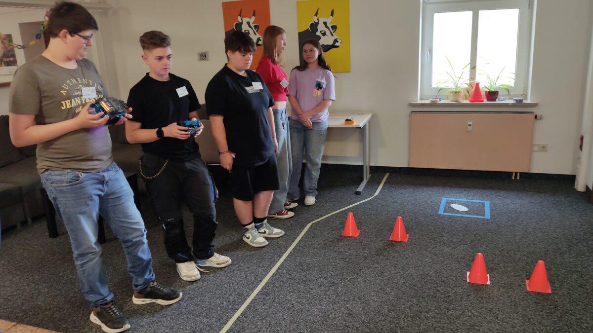 Im Berufsfeld Informatik lernten die Schüler den mBot kennen. Sie programmierten ihn mit spezieller Software und führten ein Autorennen durch. Der Rennparcours wurde auf dem Teppichboden aufgebaut und die MBots fuhren in vier Zielfelder, drehten sich um 360 Grad und jubelten.