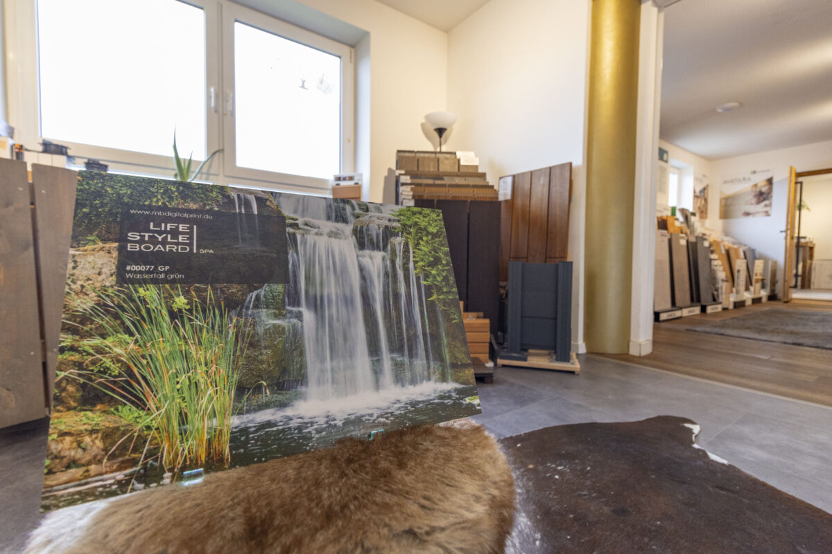 Klar, bei Wohntraum muss man Geld verdienen. Doch Irlbacher und sein Team helfen ihren Kunden dabei, nicht zu tief in die Tasche greifen zu müssen. Ganz neu im Sortiment sind zum Beispiel drei Millimeter dünne, digital bedruckte Alu-Platten. Ideal zum Beispiel für Badsanierer, die es eilig haben. Das Abschlagen der alten Fliesen oder das Drauffliesen kann man sich sparen.
