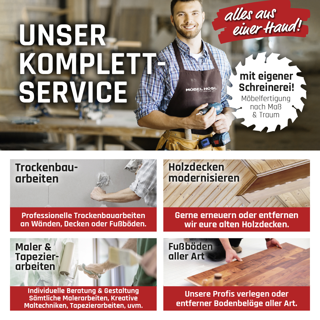 Qualität zum passenden Preis: Das ist schon seit der Gründung im Jahr 1950 das Motto von Möbel Hösl, als Albert Hösl Senior eine kleine Schreinerei in Schönkirch pachtete. Das Möbelhaus ist seinen Wurzeln treu geblieben und verfügt heute neben der großen Ausstellung auch weiterhin über einen Schreinerei-Meisterbetrieb mit eigener Ausbildung.