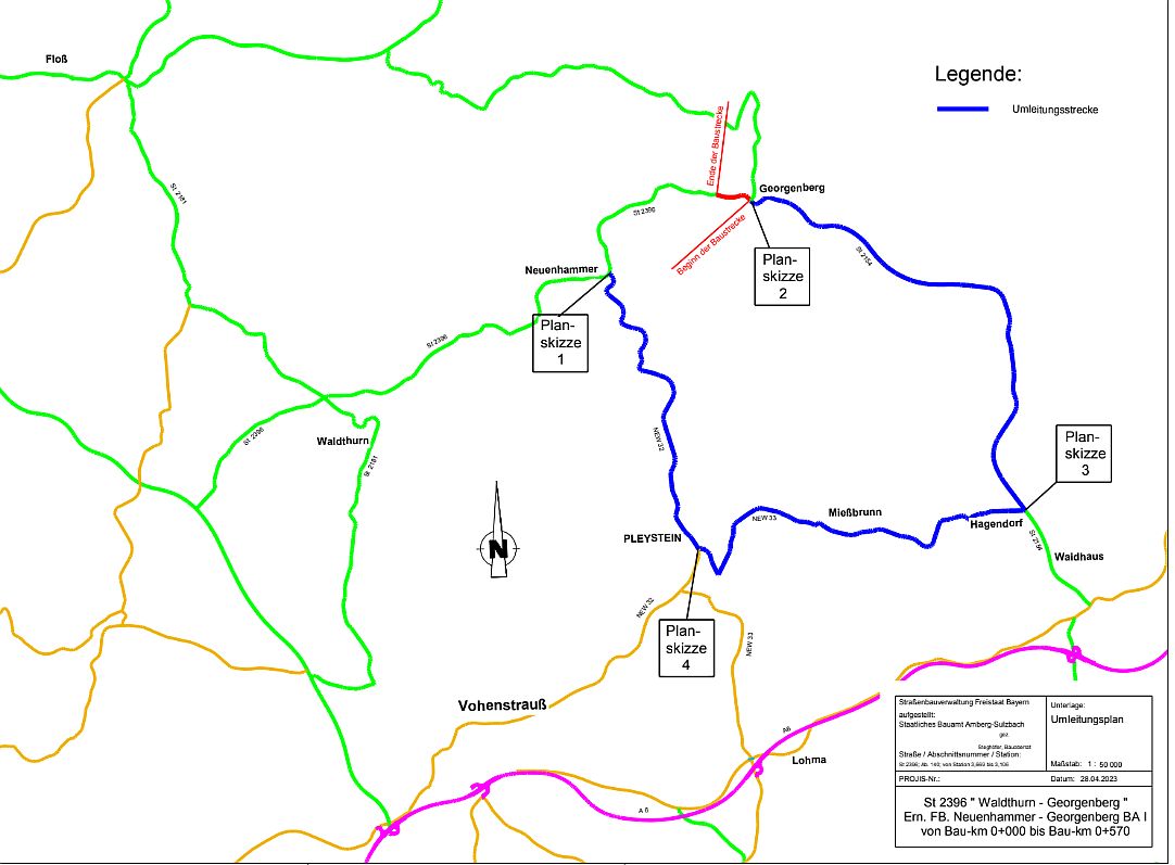 Die ausgeschilderte Umleitung erfolgt von Neuenhammer über die Kreisstraße NEW 32 nach Pleystein, über die NEW 33 über Miesbrunn und Hagendorf auf die St 2154 nach Georgenberg und in der Gegenrichtung analog. Das Staatliche Bauamt Amberg-Sulzbach empfiehlt allen ortskundigen Verkehrsteilnehmern diese Strecke während der gesamten Bauzeit zu meiden und bittet wegen der Beeinträchtigungen um Verständnis.