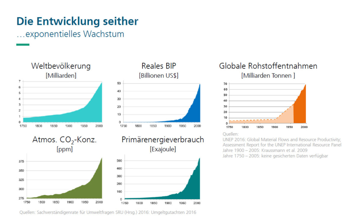 Der US-Ökonom Dennis Meadows habe vor mehr als 50 Jahren in seiner rechnergestützten Simulation in der vom Club of Rome beauftragten Studie „Die Grenzen des Wachstums“ (1972, englischer Originaltitel „The Limits to Growth“) das Systemverhalten der Erde als Wirtschaftsraum bis zum Jahr 2100 ermittelt. Inzwischen sähen wir uns bei exponentiellem Wachstum der Weltbevölkerung, des Primärenergieverbrauchs und globaler Rohstoffentnahmen mit einem immer bedrohlicheren Klimawandel und einem sich zuspitzenden Rohstoffmangel konfrontiert.