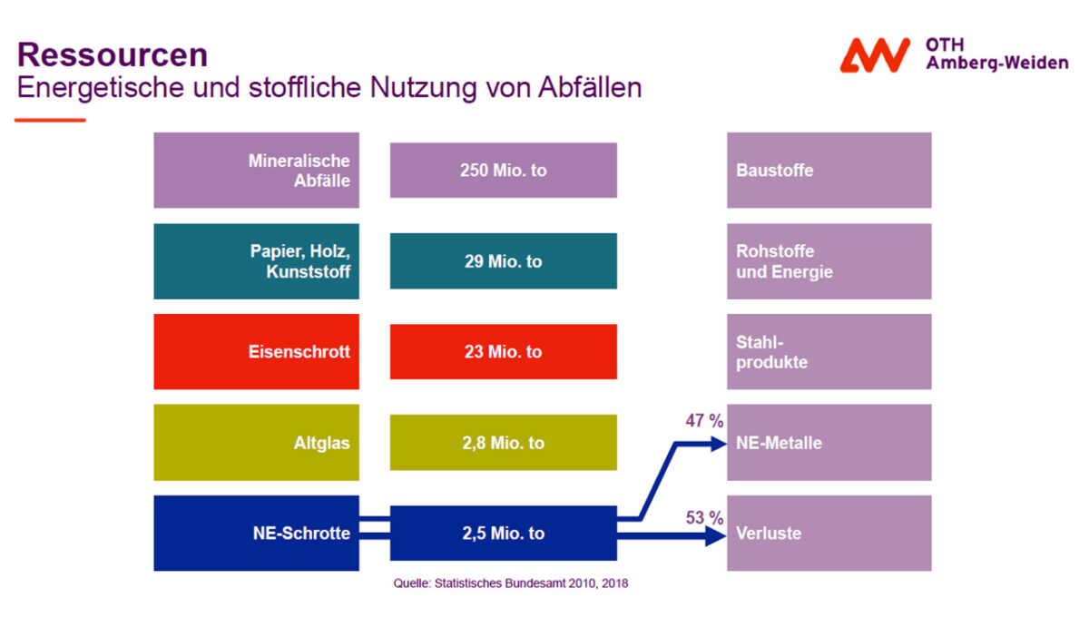 Von 29 Millionen Tonnen Papier, Holz und Kunststoff würden 34 Prozent energetisch verwertet, 54 Prozent stofflich und 12 Prozent sei Schwund. Von 23 Millionen Tonnen Eisenschrott wanderten 87 Prozent in die Stahlproduktion, 13 Prozent seien Materialverluste. Von 2,8 Millionen Tonnen Altglas würden 87 Prozent in neuen Glasprodukten wiederverwendet, der Rest sei nicht mehr zu gebrauchen. Und von 2,5 Millionen Tonnen NE-Schrotten (alle Metalle außer Eisen) schaffen es 47 Prozent in neue NE-Metalle und 53 Prozent gingen verlustig.