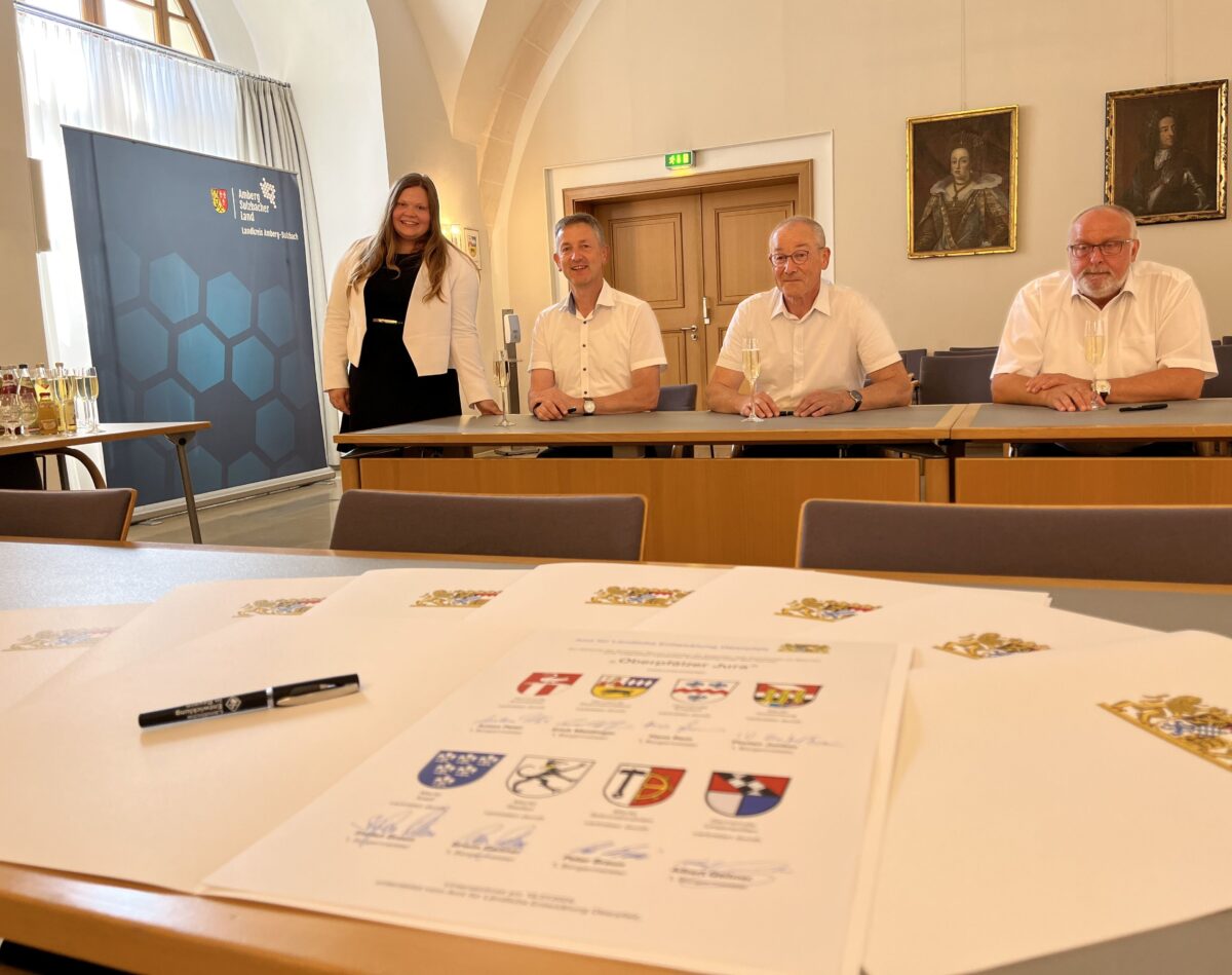 Die Gründung einer Integrierten Ländlichen Entwicklung (ILE) strebten acht Kommunen des südlichen Landkreises Amberg-Sulzbach an und brachten im Frühjahr eine Absichtserklärung auf den Weg. Im Beisein von Landrat Richard Reisinger, dem Leitenden Baudirekter des Amts für Ländliche Entwicklung (ALE) Oberpfalz in Tirschenreuth, Kurt Hillinger, der Wirtschaftsförderin des Landkreises Angela Seidel sowie den Bürgermeistern der acht Kommunen fand nun die feierliche Unterzeichnung der Kooperationsvereinbarung zur ILE Oberpfälzer Jura im König-Ruprecht-Saal des Landratsamtes statt.