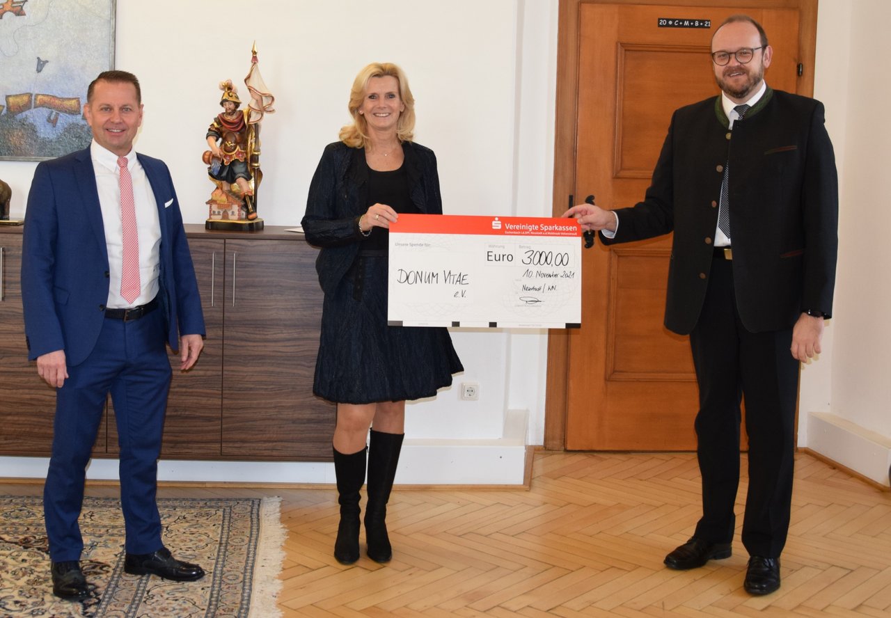 Zu einem erfreulichen Termin hatte Landrat Andreas Meier in sein Dienstzimmer eingeladen. Zusammen mit Gerhard Hösl, dem Vorstandsvorsitzenden der Vereinigten Sparkassen Eschenbach, Neustadt/WN und Vohenstrauß, konnte er an Andrea Lang, Bevollmächtigte von Donum Vitae in Weiden einen Spendenscheck über 3.000 Euro überreichen.