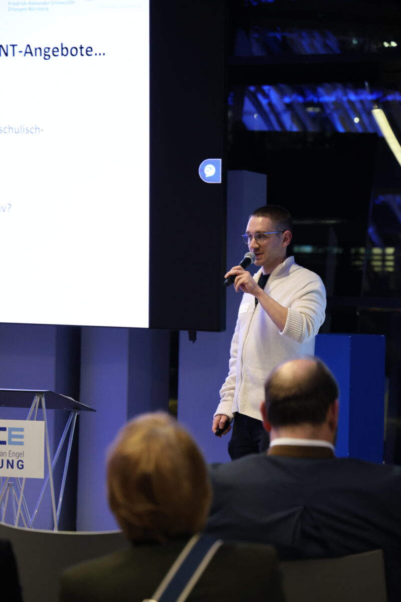 Drei Kurzvorträge beleuchteten MINT aus unterschiedlichen Perspektiven: Lukas Ketscher von der Friedrich-Alexander-Universität Erlangen erläuterte, welchen Einfluss außerschulische MINT-Angebote auf die Begeisterung junger Menschen haben.