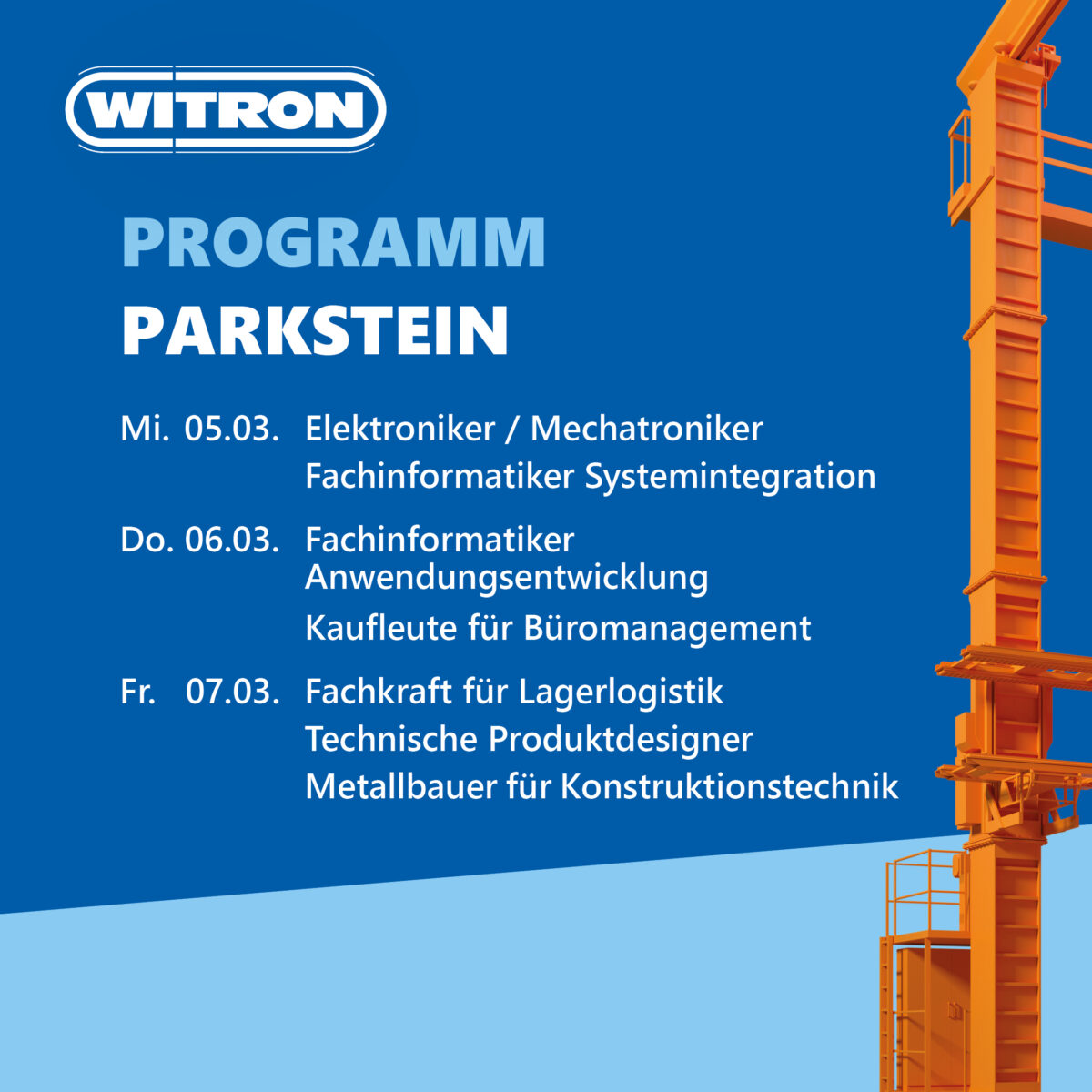 WITRON ist einer der weltweit führenden Anbieter für hochautomatisierte Logistiksysteme – und bietet spannende Ausbildungsplätze mit Zukunft. In den Faschingsferien hast du bei den WITRON-Schnuppertagen von 5. bis 7. März jeweils von 8 Uhr bis 15 Uhr die Topchance, das Unternehmen unkompliziert und doch intensiv kennenzulernen und in seine große Ausbildungswelt einzutauchen. Jetzt direkt anmelden!