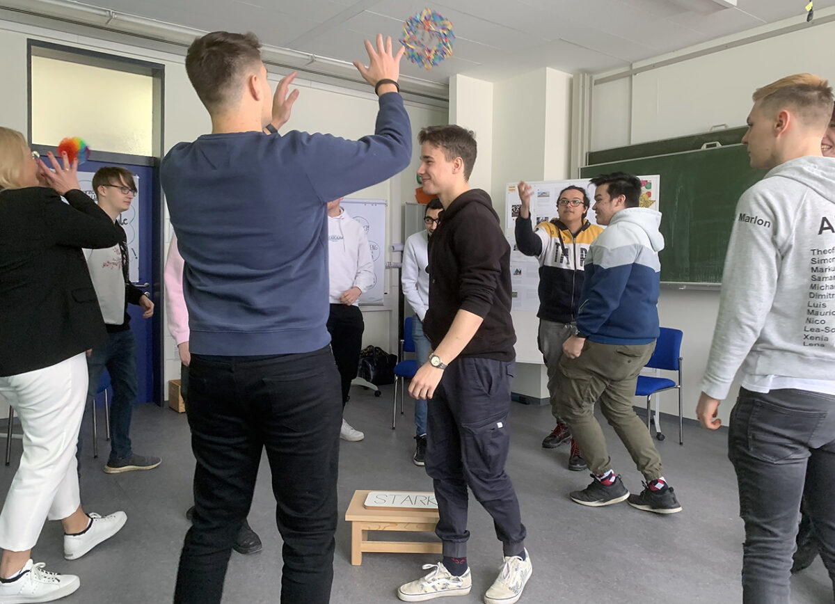 Spielerisches Lernen und Teambuilding steht auch bei der nächsten Übung, der Namenskette auf dem Programm: Die Jungs werfen einem Klassenkameraden einen Ball zu und sagen laut seinen Namen. So entsteht Vertrautheit, Routine, beim Vorwärtsball und beim Rückwärtsball. Alles in Bewegung. „Warum haben wir‘s gemacht?“