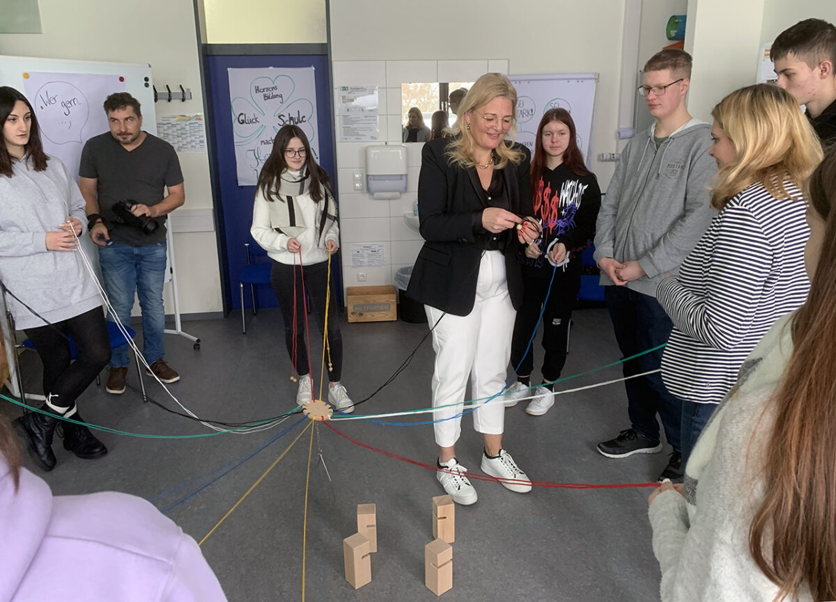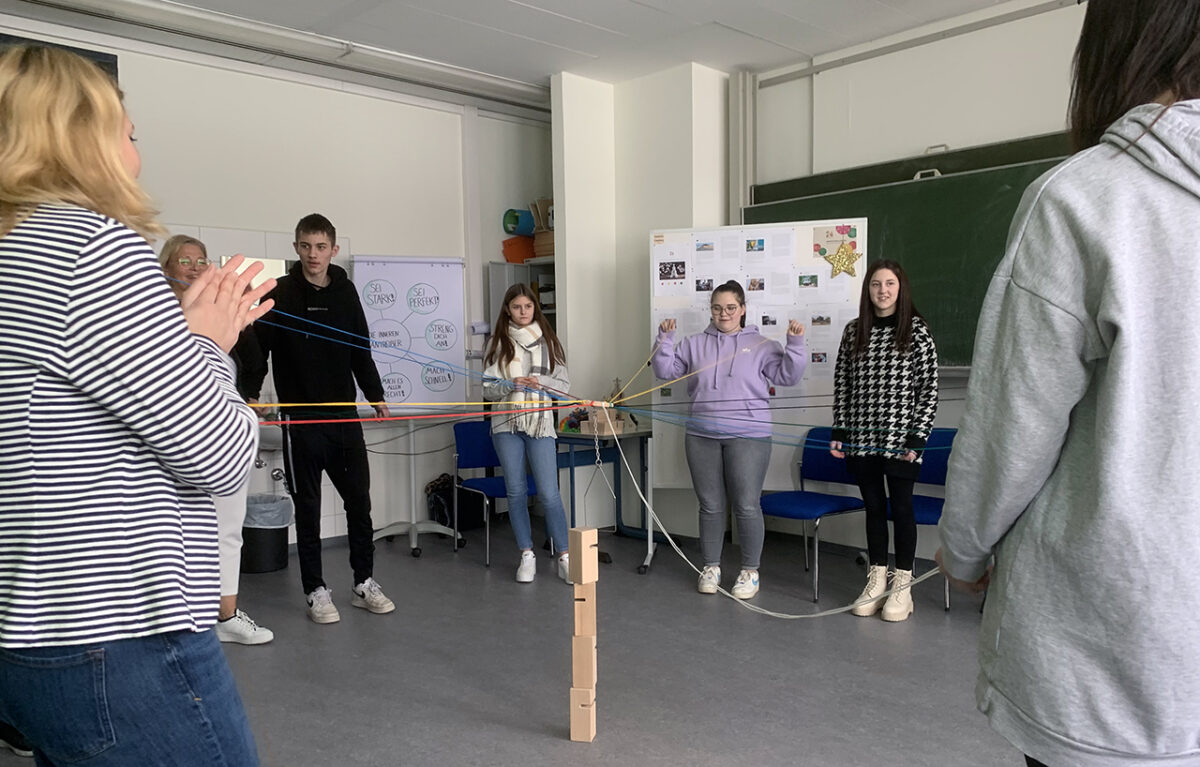 Die Mädels und Jungs schauen etwas ratlos auf vier hölzerne Bauklötze. Und sie haben alle Hände voll zu tun mit der Entwirrung ihres Arbeitsgeräts: Eine hölzerne Scheibe, an der zehn doppelte Schnüre in verschiedenen Farben befestigt sind – je zwei pro Schüler. Schnell wird klar, wofür die Übung taugt. Die Gruppe muss einen gemeinsamen Rhythmus finden, um die Klötze mittels Ring aufeinander zu schichten. „Dürfen wir sprechen?“ – „Unbedingt!“ – „Alex, du bist Klassensprecher, mach was!“ – „Warum muss ich immer? Also, erst mal runter. … Michelle, du auch!“