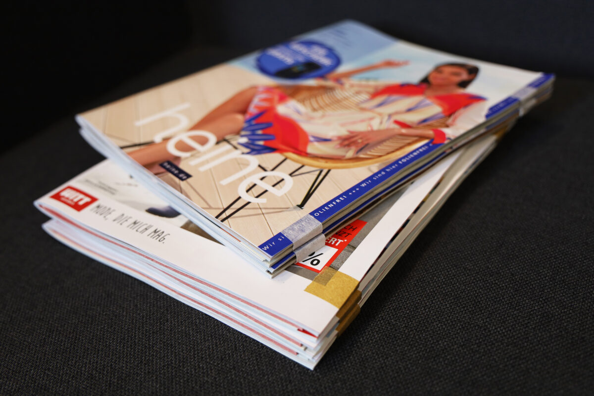 Dabei wird der Katalog inklusive der eingelegten Beilagen mit zwei Klebestreifen geschlossen, EcoFix genannt. Die Vertriebsmarke heine wird ab der kommenden Saison Frühjahr/Sommer 2024 weitestgehend auf Folierungen verzichten.