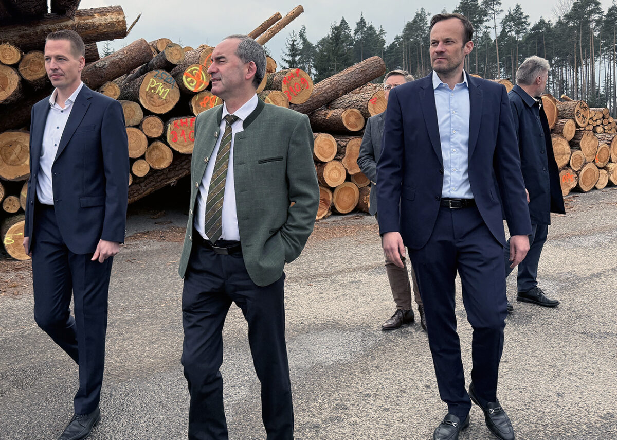 „Wenn es nicht allzu sehr regnet“, erklärt eine freundliche Dame aus der Pressestelle des Ministeriums. Das Wetter hält, der Tross mit dem Minister, Stephan Lang, Geschäftsführer des neuen Sägewerk-Betreibers, der Rettenmeier Holding AG, Andreas Cordes, Geschäftsführer der Cordes GmbH, die wiederum Overhead der Rettenmeier Holding ist, Tobias Reiß, Vizepräsident des Landtags, Landrat Roland Grillmeier, Bürgermeister Lothar Müller und die diversen Medienvertreter setzt sich in Bewegung.