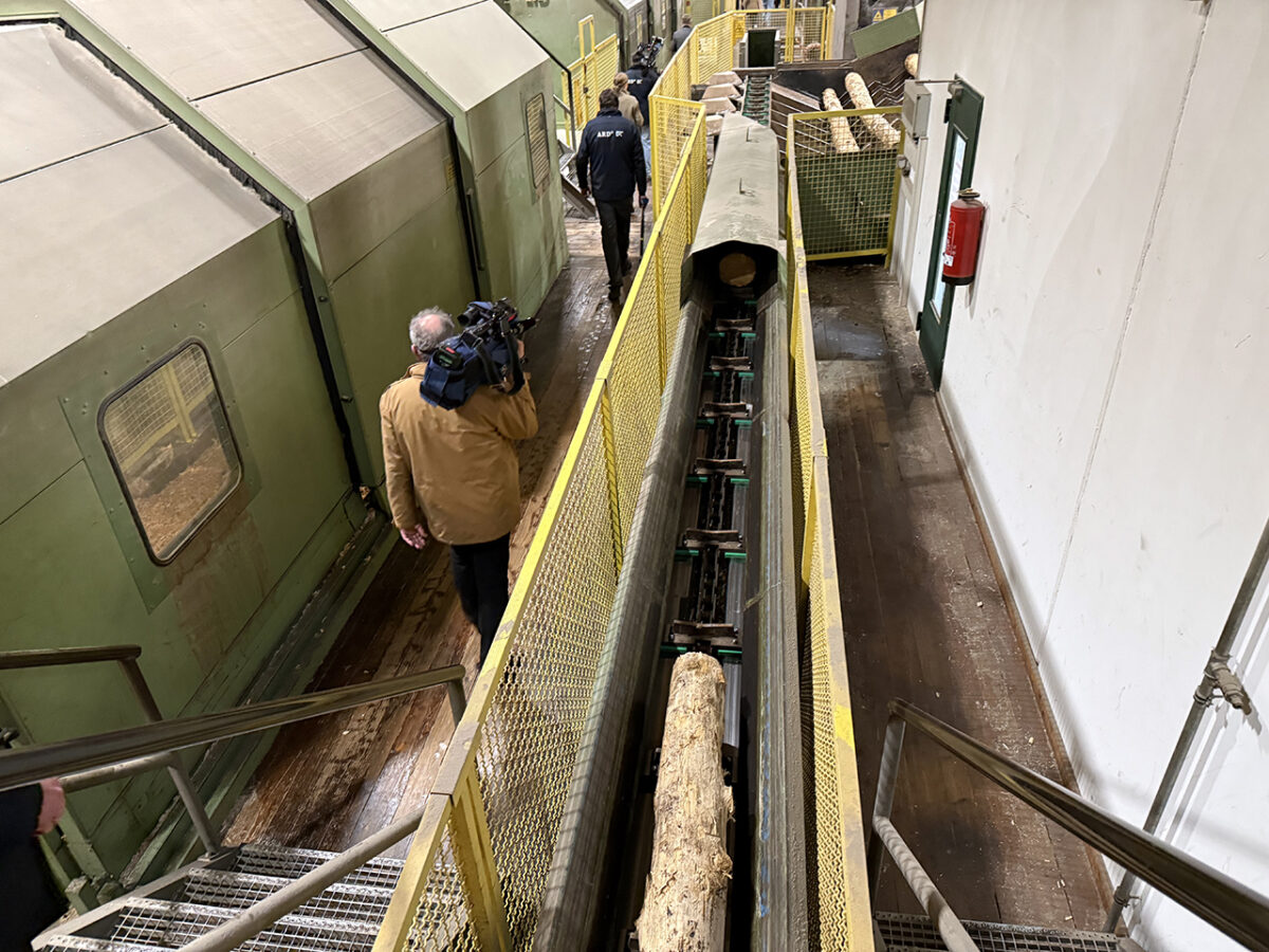 Jeder der mächtigen Holzstöße taugt als monumentaler Foto- und Videohintergrund für die Kameramänner und -frauen, weshalb die gutgelaunte Truppe bereitwillig Station mit Smalltalk macht. „Alles so sauber“, scherzt der Minister, „ist es da immer so sauber?“ Man darf annehmen, dass die Mitarbeiter nicht eigens den ministeriellen Weg von Sägespänen befreit haben.