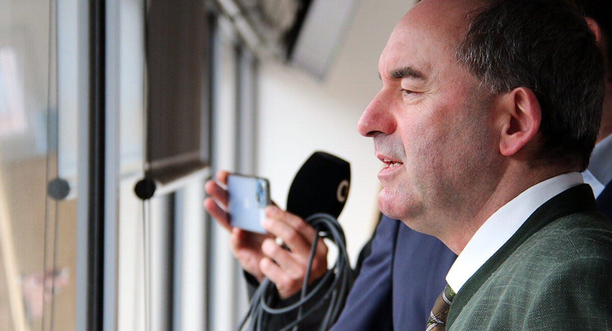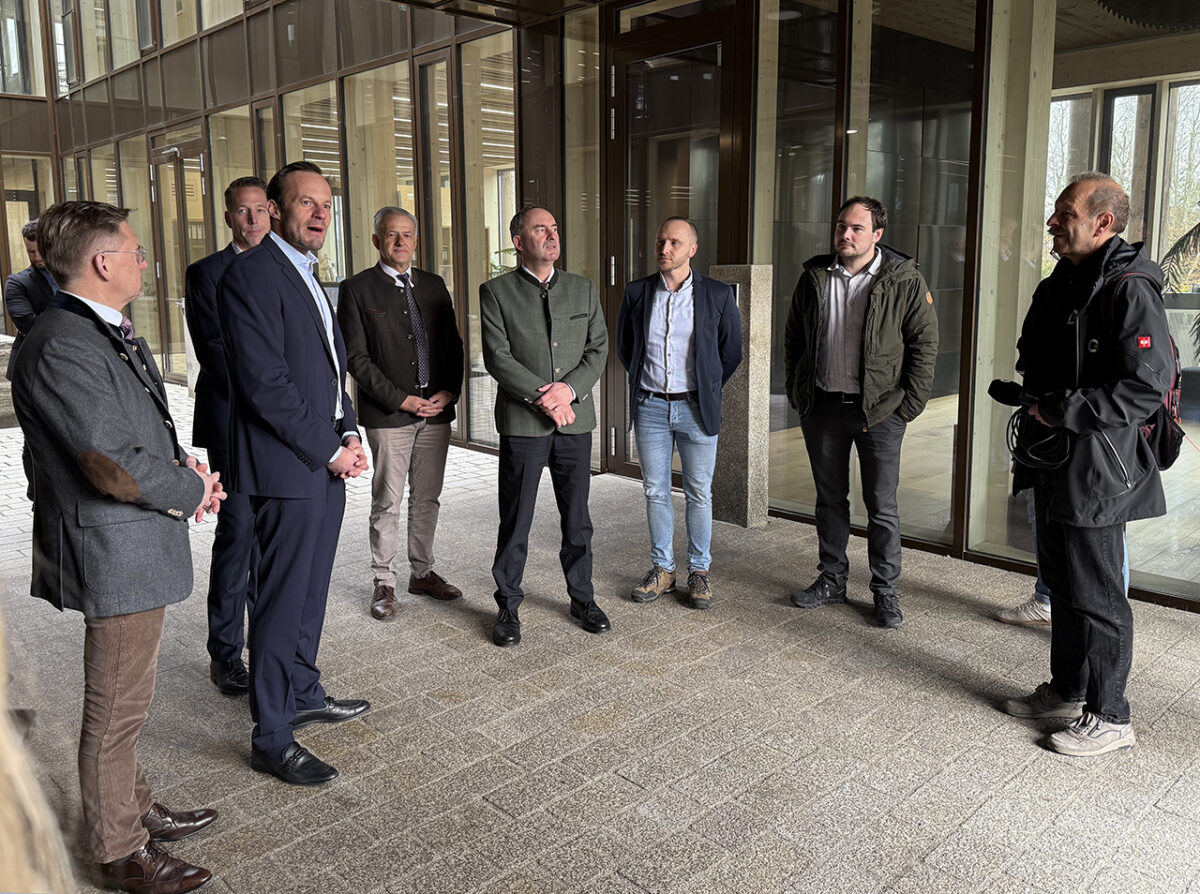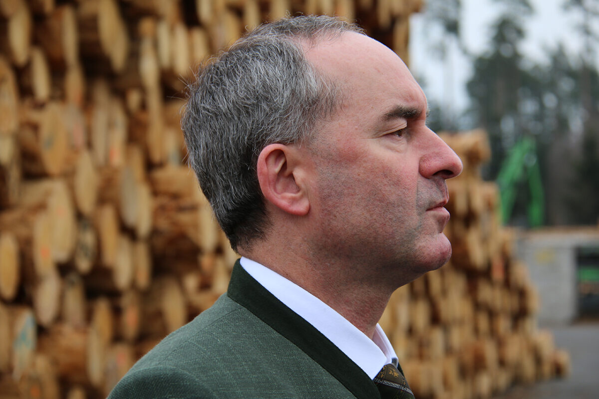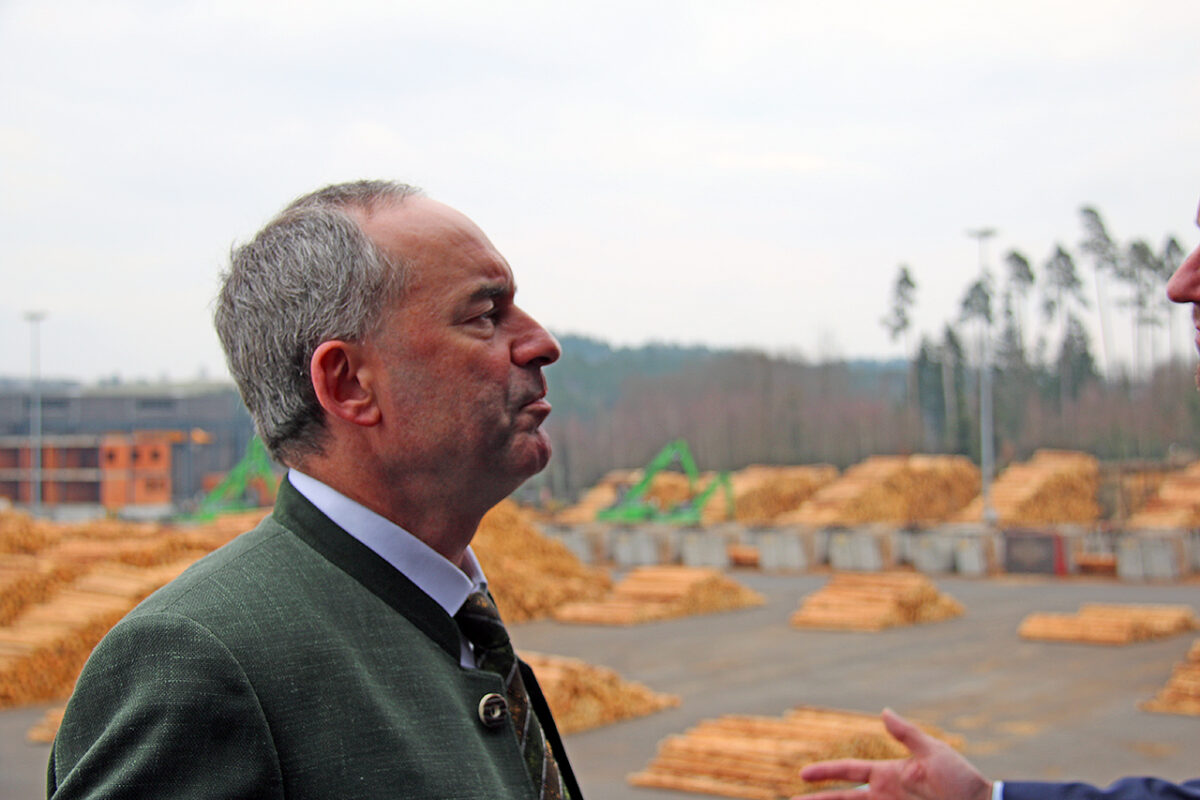 Als Bayerns Wirtschaftsminister Hubert Aiwanger dann im Gefolge eines Polizei-Wagens und umringt von Personenschützern aus dem Heck seines schwarzen A8 steigt, schüttelt der Freie-Wähler-Chef das Haupt beim Blick auf die imposante Baumstamm-Fassade des Verwaltungsgebäudes, als ein dienstfertiger Mitarbeiter fragt: „Sie waren ja schon mal da?“ Auf der Tagesordnung steht: „Rundgang mit dem Minister.“