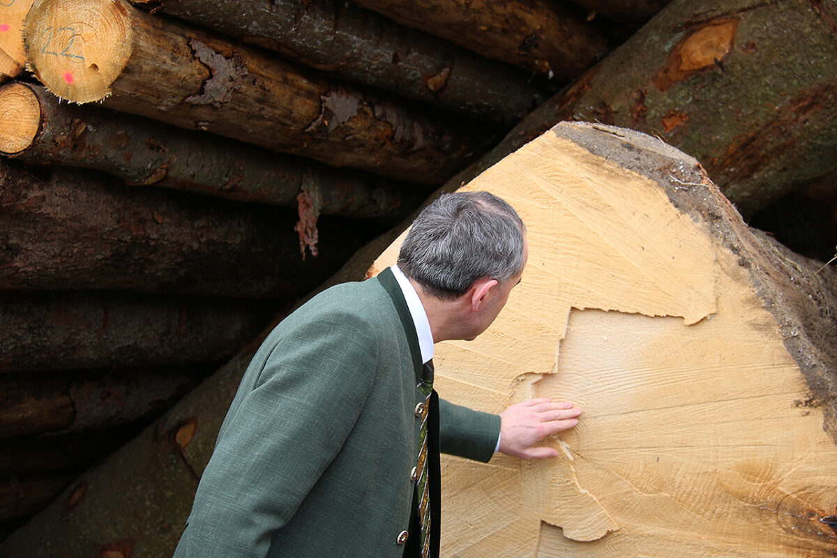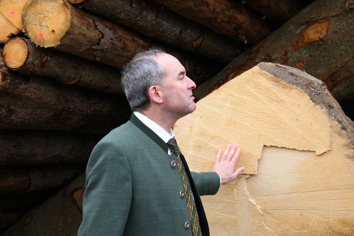 Bayerns Wirtschaftsminister Hubert Aiwanger beweist Holzsachverstand: Er beschreibt den Werdegang dieses „Oschis“ anhand der Jahresringe des Baumriesen. Foto: Jürgen Herda