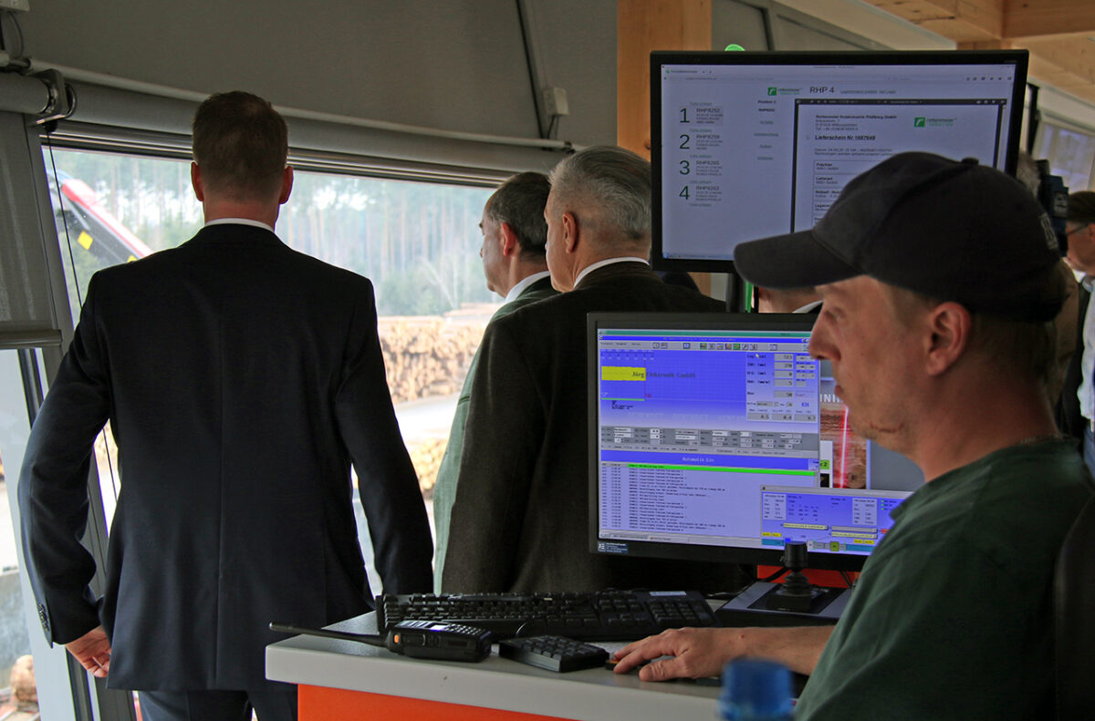 Rettenmeier-Chef Stephan Lang (von links), Bayerns Wirtschaftsminister Hubert Aiwanger und der Tirschenreuther Landtagsabgeordnete Tobias Reiß beobachten fasziniert die IT-gesteuerte Arbeit an den Schalthebeln des Sägewerks. Foto: Jürgen Herda