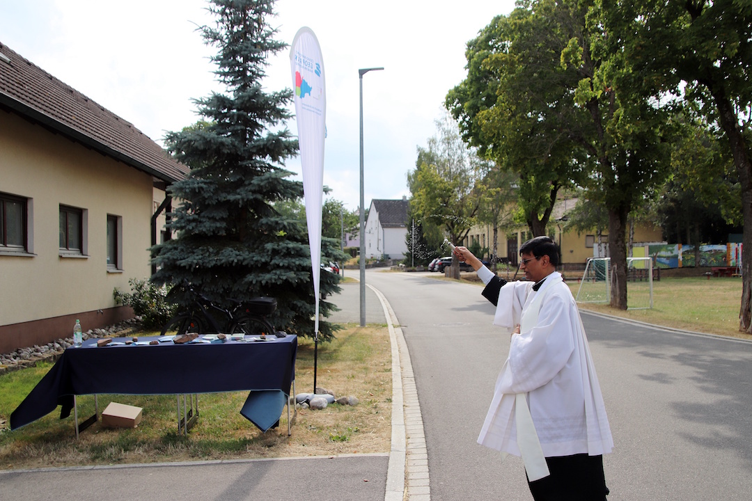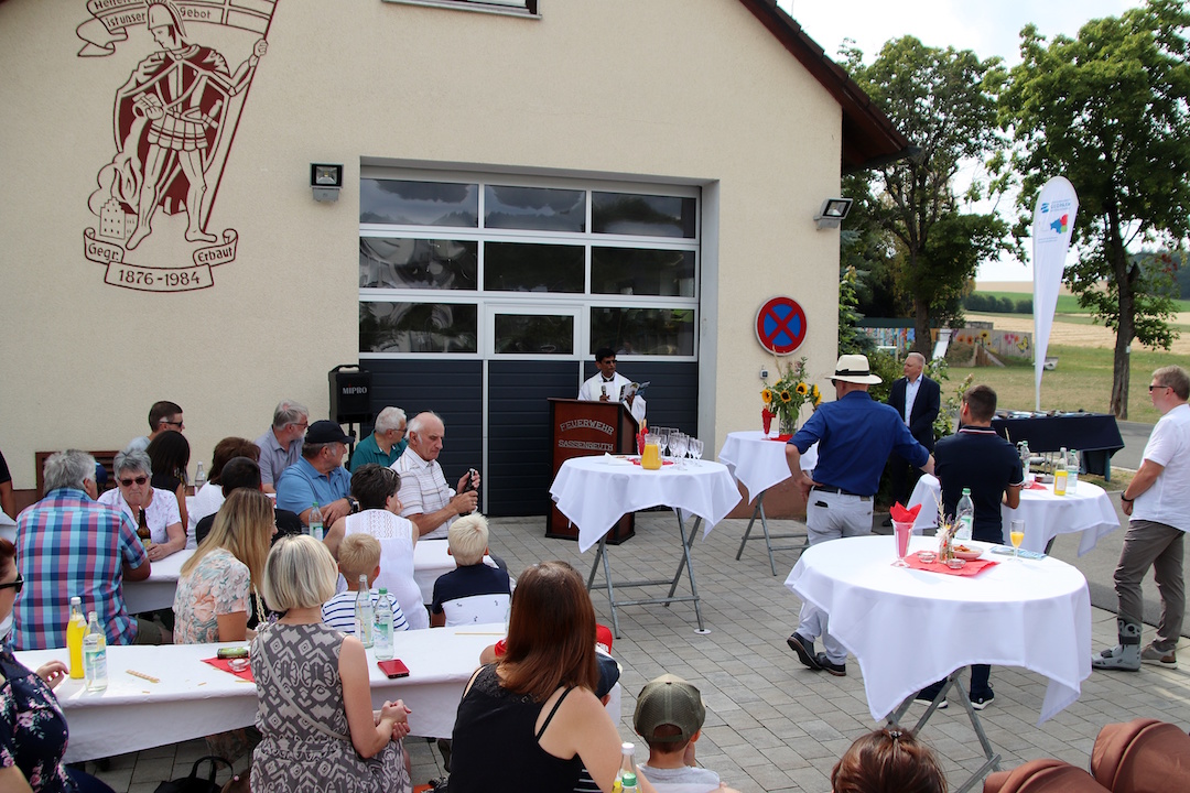 Nun wurde vor dem Sassenreuther Feuerwehrhaus der neue Wanderweg eingeweiht. Dazu hatte sich die Sassenreuther Dorfgemeinschaft sowie der Kirchenthumbacher Bürgermeister Jürgen Kürzinger und mehrere Gemeinderäte eingefunden. Den kirchlichen Segen gab Pfarrer Dr. Augustin Lobo und wünschte allen Wanderern eine gesunde Heimkehr. Kürzinger sprach in seiner Rede von einem „steinigen und schwierigen Weg“. Er bedankte sich bei allen Beteiligten für die Ideen und das Mitwirken bei der Umsetzung des ersten Geo-Wanderwegs in der Marktgemeinde.