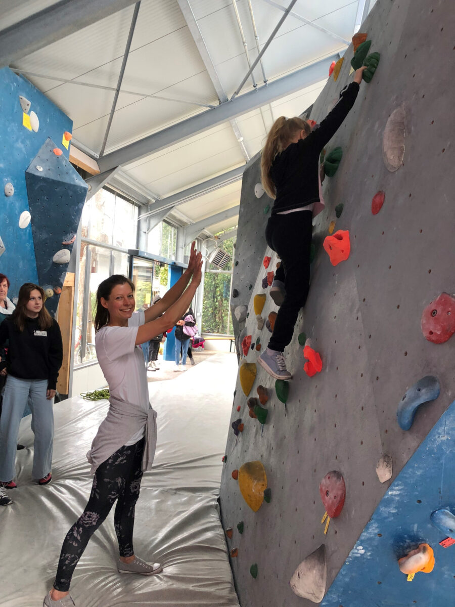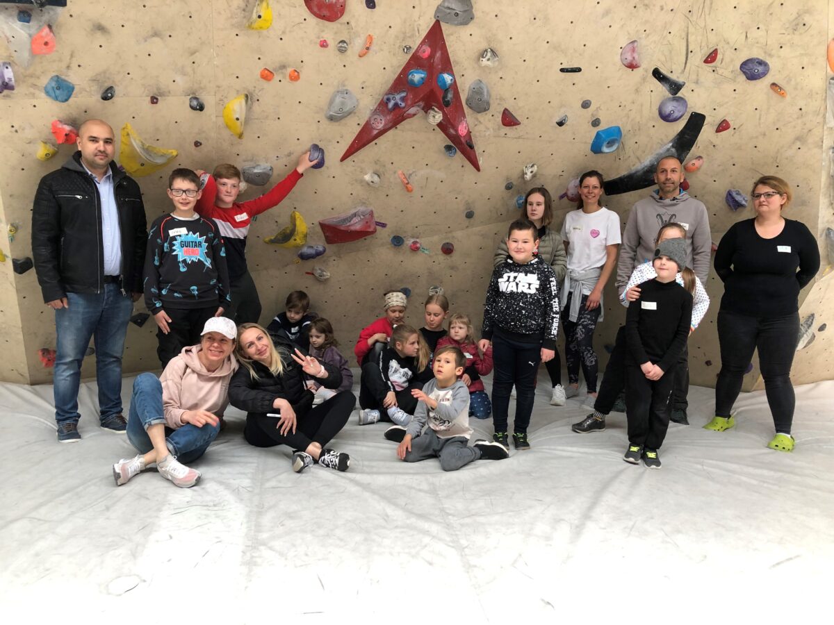 Sicherheitsschulung durch Stephan Bornschlegl und Andrea Maier, die Kraxler sofort loslegen. Die Besonderheit beim Bouldern: Anders als beim Klettern verzichtet man auf Sicherungsseil und Gurt. Zum Schluss waren alle Kinder einstimmig der Meinung: Das war chudovo (ukrainisch: super).