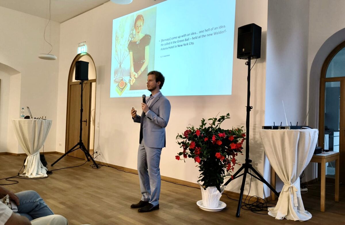 Der Referent zitierte die Gründerväter der modernen Propaganda Edward Bernays (1891 – 1995), Neffe des berühmten Psychoanalytikers Sigmund Freud, und Walter Lippmann (1889 -1974) und beschrieb die Methoden der Propaganda und ihre Werkzeuge. Man sollte sich von Angst, Einheitsmeinung und Kreuzpropaganda wie Hass und Mitleid nicht beeindrucken lassen, sondern die „Fäden zerschneiden, an denen wir hängen“.