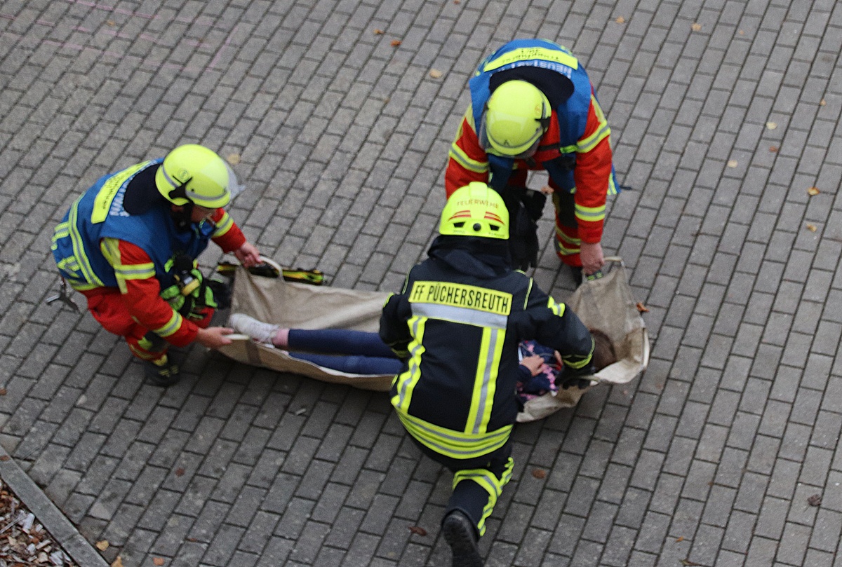 Beim angenommenen Brand war es den Lehrkräften gelungen, fast alle Kinder rechtzeitig aus dem verrauchten Gebäude zu führen. Doch einige „Schüler“ sowie Erwachsene galten als vermisst oder schwer verletzt – genau das Szenario, das Übungsleiter Stefan Radies in seiner monatelangen Vorbereitung geplant hatte. Während die ersten Atemschutztrupps in die Schule eindrangen, richtete das BRK im benachbarten Sportheim des TSV Püchersreuth einen Versorgungs- und Sammelpunkt ein.