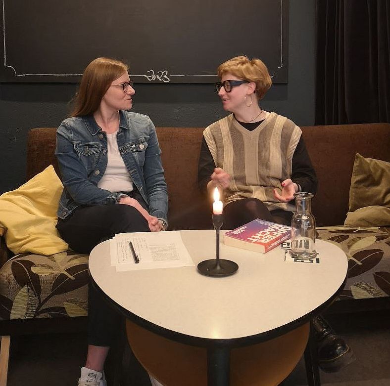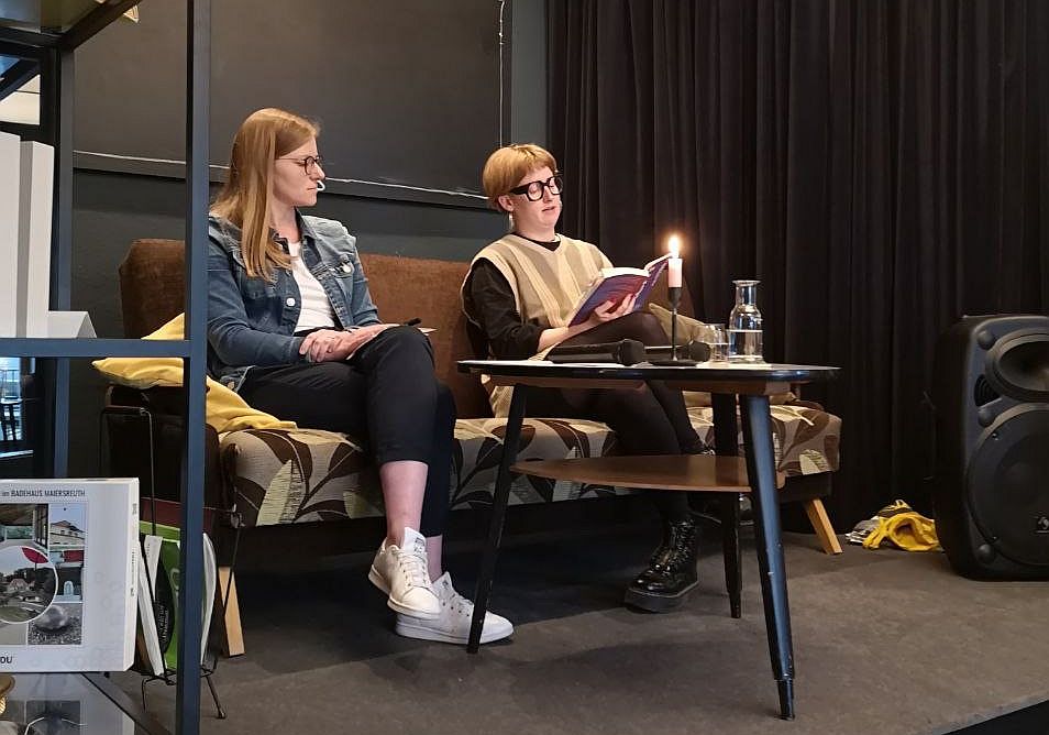 Nicole Bäumler (links) moderierte bei der Lesung das Gespräch zwischen dem Publikum und der Autorin Nora Kellner (rechts). Foto: Adrian Kuhlemann